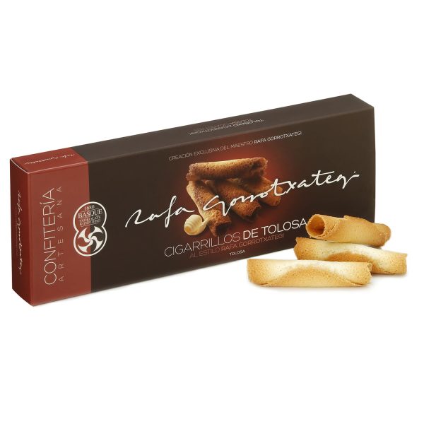 Finas láminas enrolladas, crujientes y doradas, con un delicado sabor a mantequilla. Un clásico imprescindible de la repostería tolosarra.